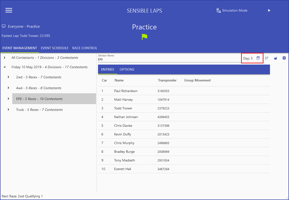 Divisions can be assigned to specific days to handle events that span multiple days.