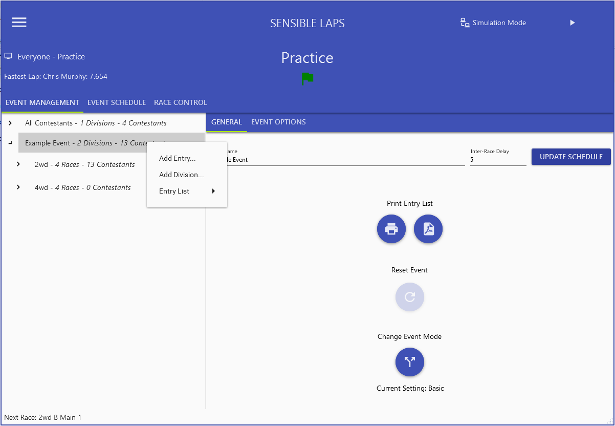 Right clicking elements on the left gives a context menu specific to that item. For example, right clicking on an event gives a menu item to add a new division, add an entry or print the current entry list for that event.