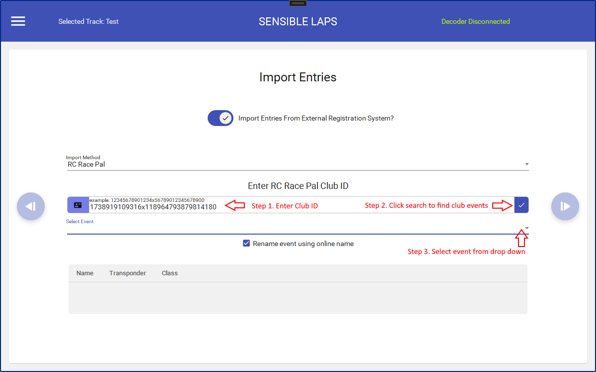 In sensible laps, choose RC Race Pal in the drop down and paste the club ID into the box