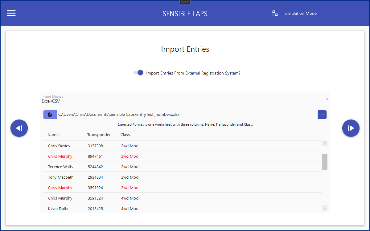 Duplicate entries (same name or same transponder used in the same class) are marked in red in the preview entry list.