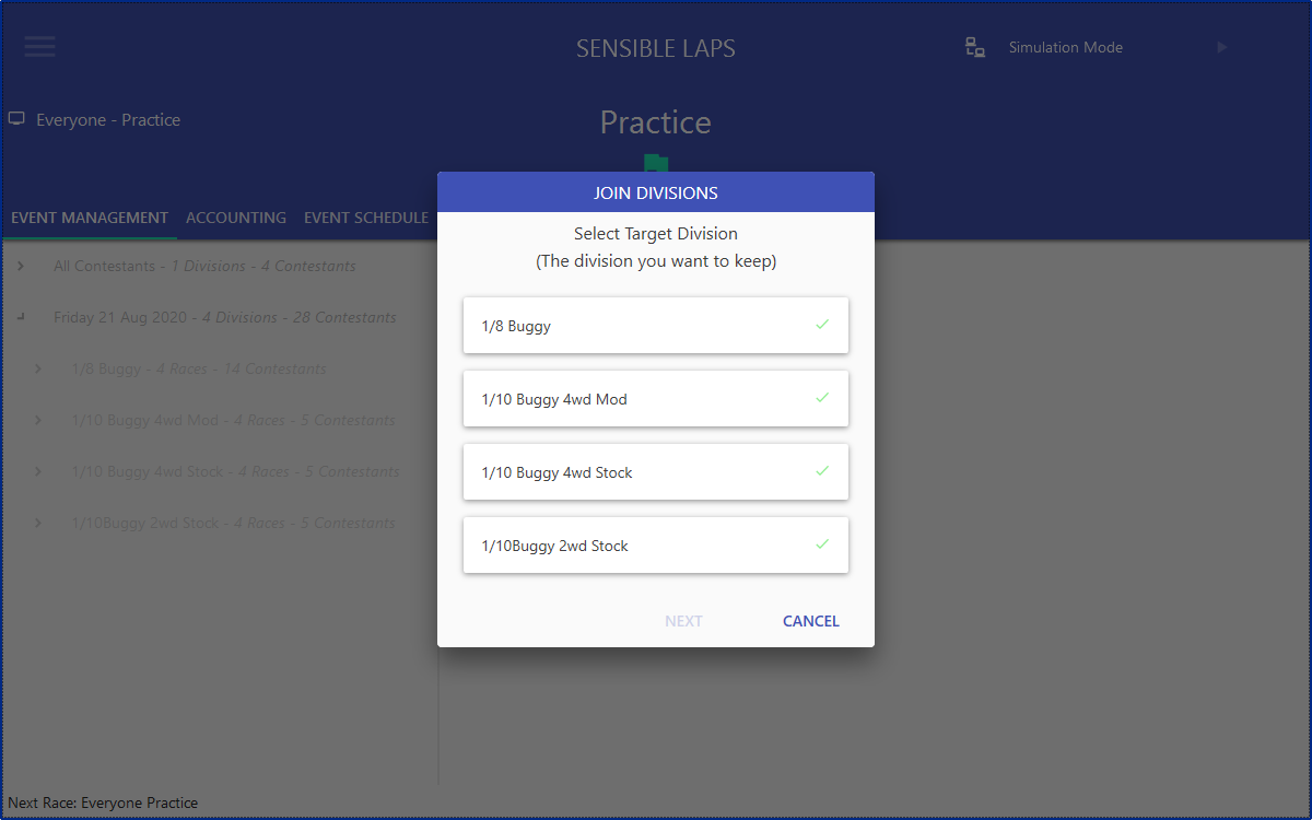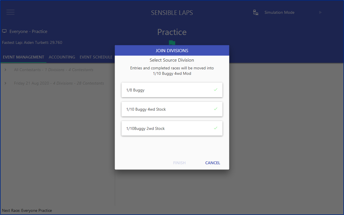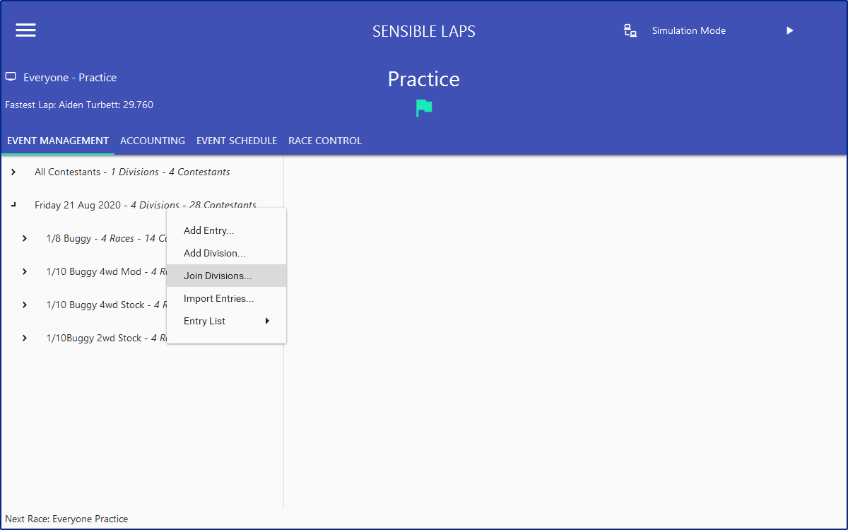 The "Join Divisions" dialog can be accessed by right clicking the event in event management as shown below