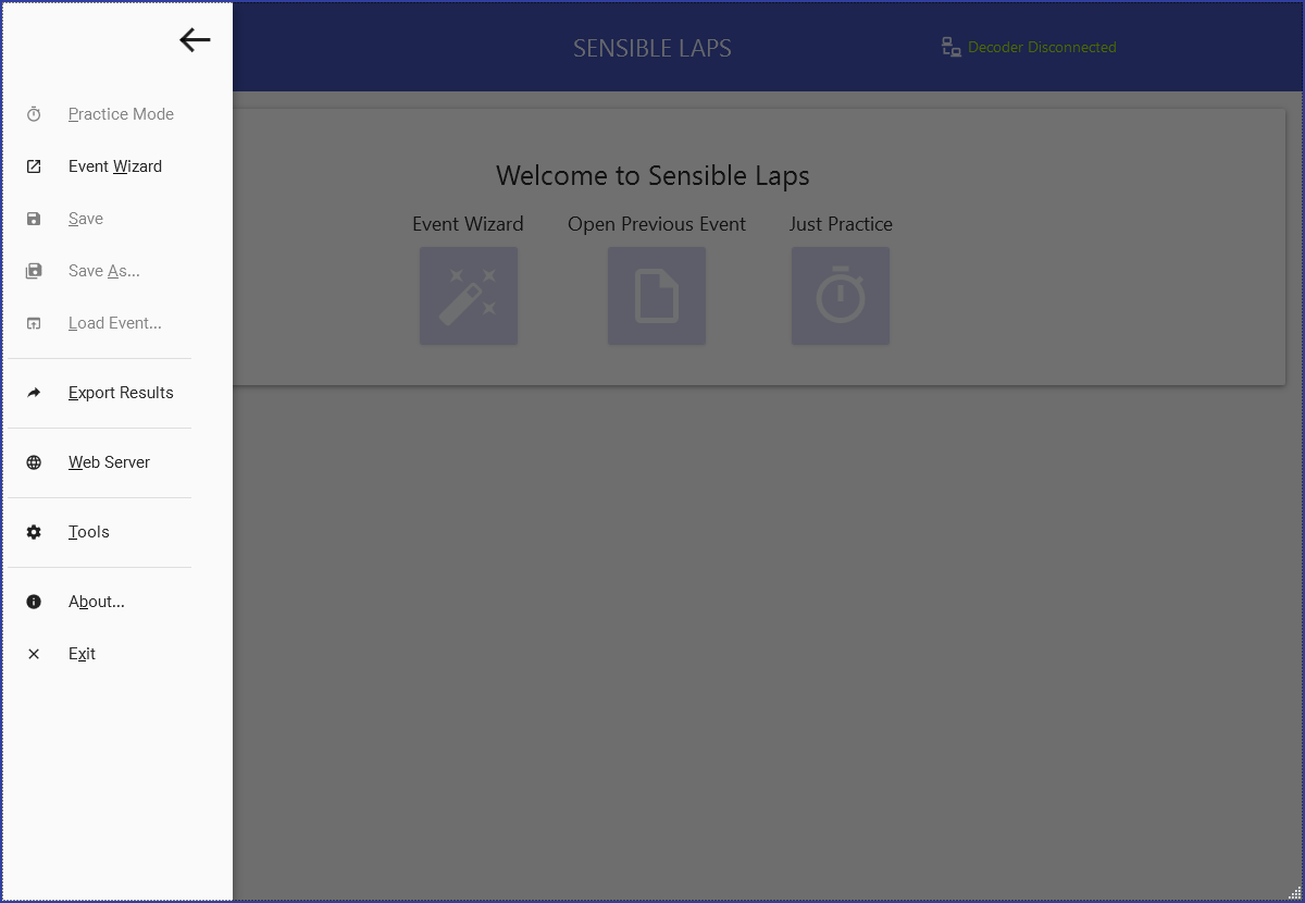 The menu offers practice mode toggle, load and save options, access to the event wizard, results export, web server control, access to settings and the about dialogue.
