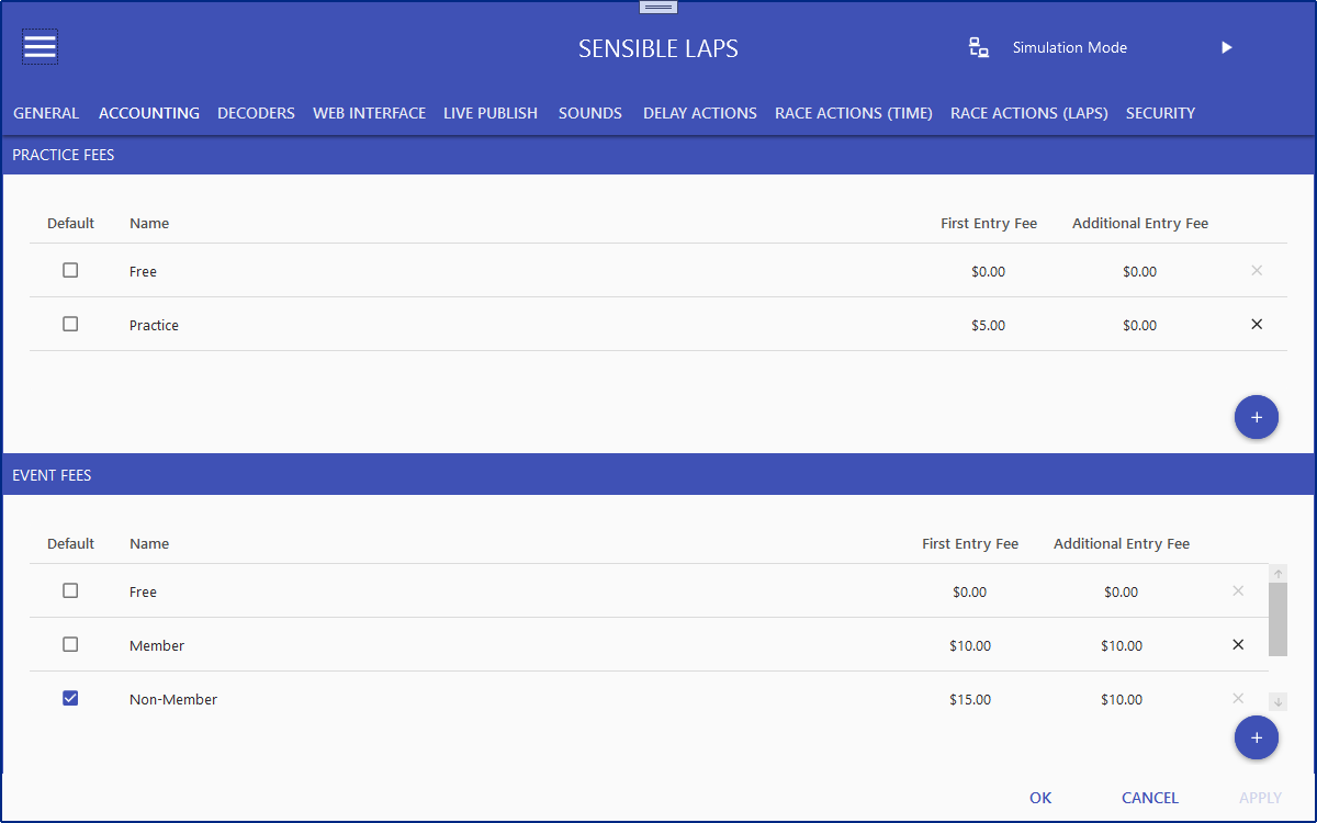 This is the fee used for all additional divisions entered. This value is used when a new event is created, changing the value here, does not affect the currently loaded event or any past events.