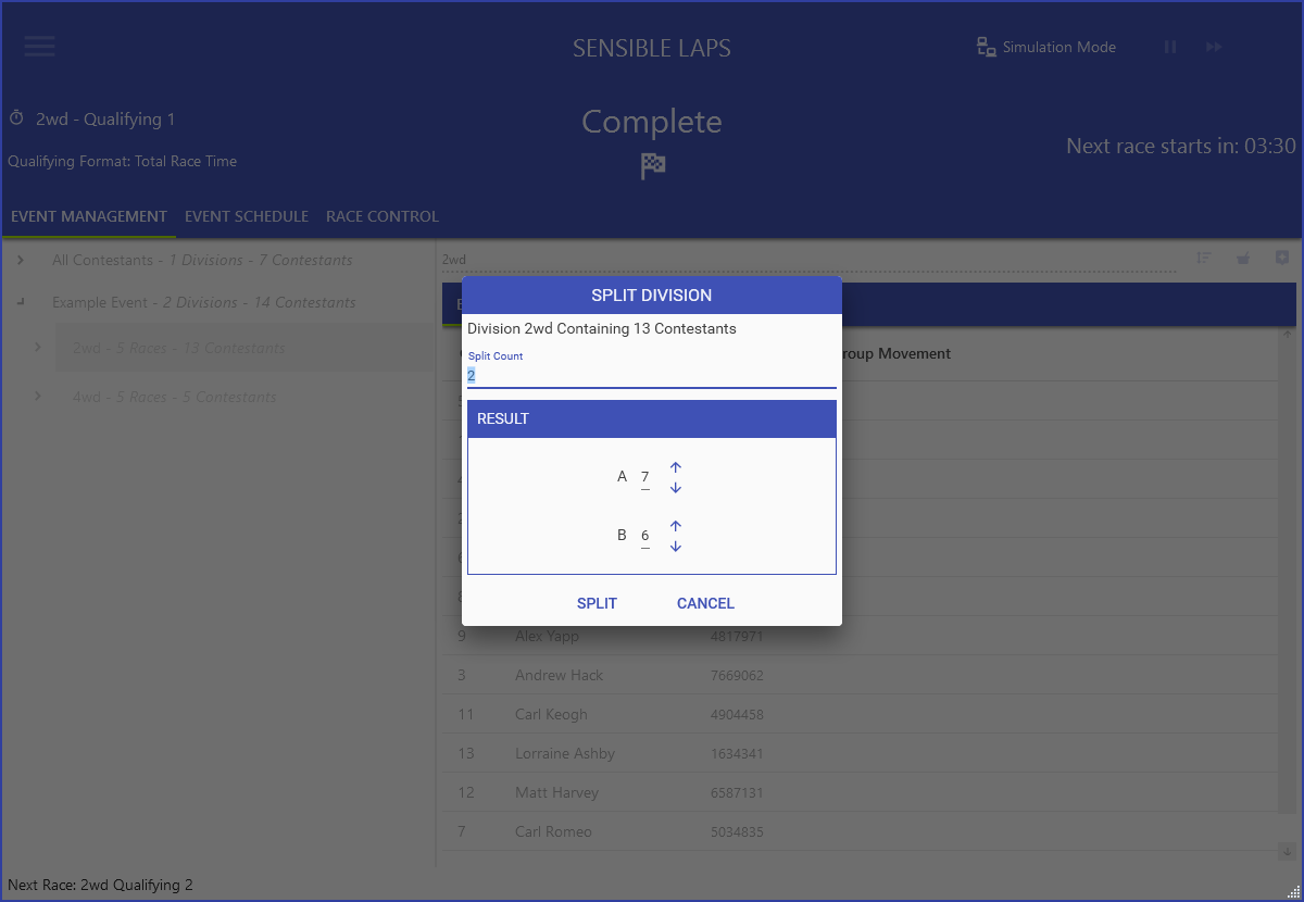 right click the division in Event Management and select "Split".
